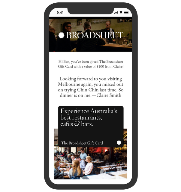 The Broadsheet Gift Card can be used at almost any restaurant, cafe or bar around the country. Choose from physical gift cards in premium envelopes that can be delivered straight to their door, or eGift cards for great last minute gifts.